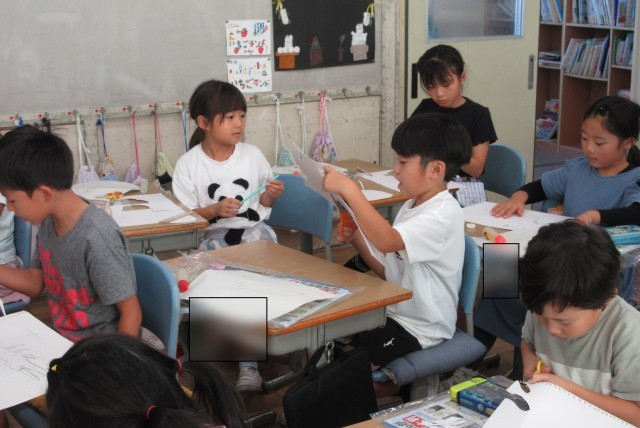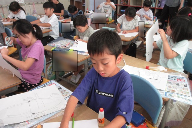 図工「楽しくうつして」では、版画で刷りたい動物を描いています。動物の体のパーツごとに紙を切り取り、そこに毛糸や凸凹したものを貼り付けて模様を作っています。どんな作品にしようか、うきうきして活動しています。