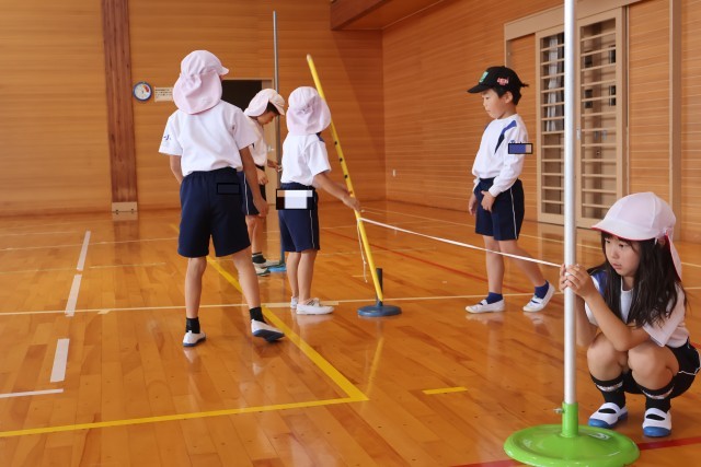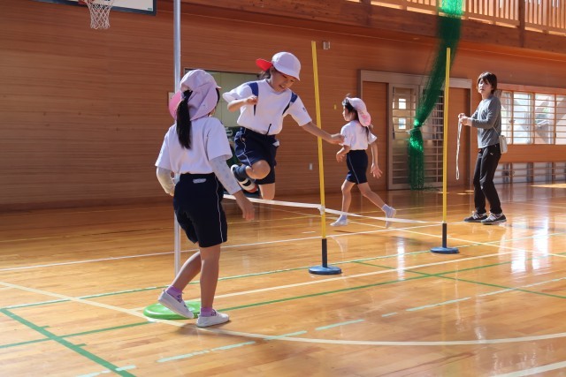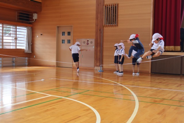 ゴム紐を使って、その上を跳ぶ練習をしました。自分たちで楽しめるようなコースを考えて作っている様子が