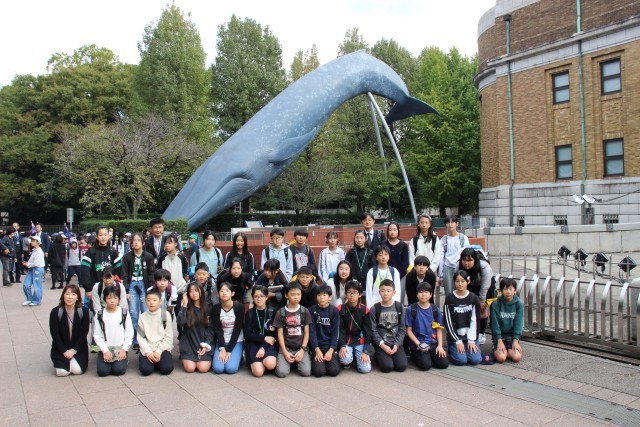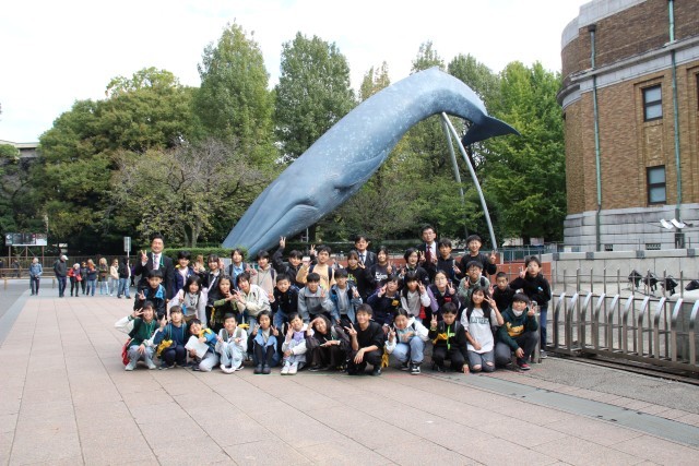 上野を散策し、国立科学博物館 シロナガスクジラの前でみんなでパチリ。