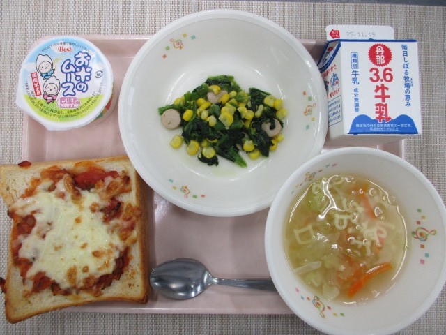 ☆こんだて☆ ピザトースト 牛乳 ほうれん草のソテー ABCマカロニスープ お米のムース