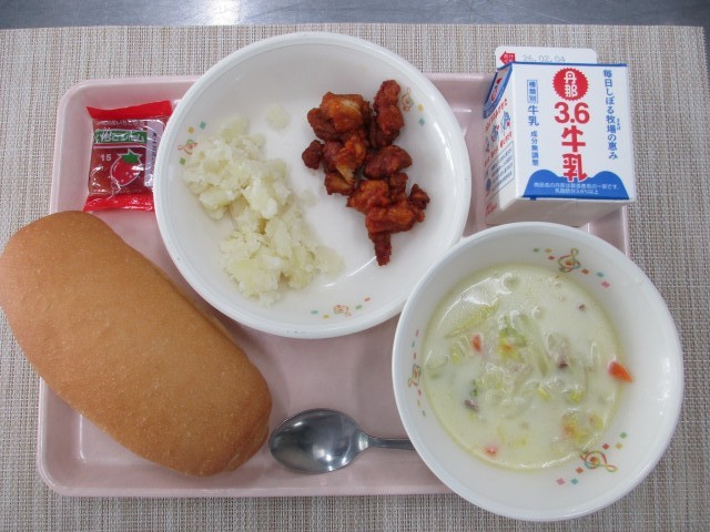 ☆こんだて☆ ロールパン いちごジャム 牛乳 鶏肉のノルウェー風 こふきいも 白菜のミルクスープ
