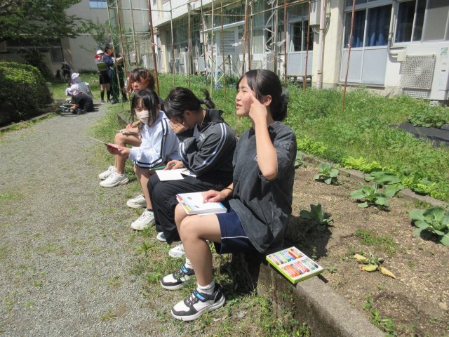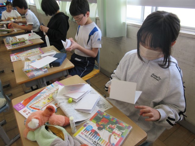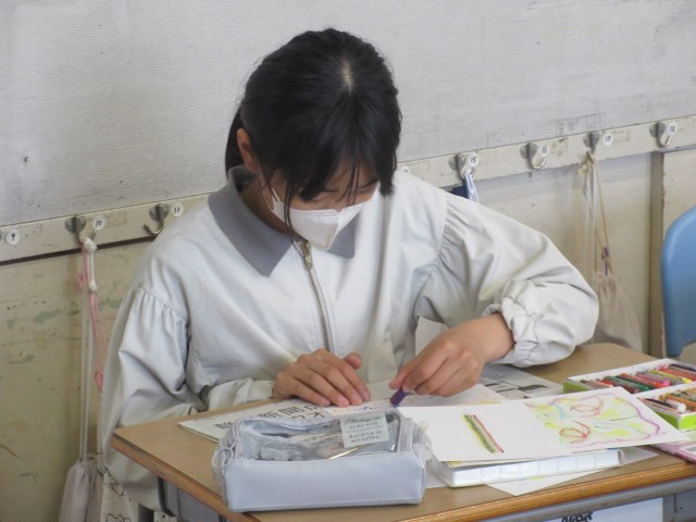 図工では、身近な音を色や線や音で表現する学習をしました。クーピーやクレヨンを駆使し、自分のイメージを形にするのを楽しみました。