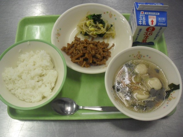 今日はビビンバです。ごはんに肉炒めとナムルを混ぜて食べました。今日のナムルには、大豆もやしを使いました。給食で普段使っているのは緑豆もやしです。違いがわかったかな?