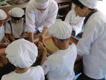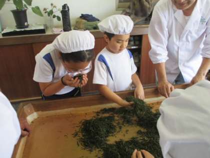 総合学習の一環として、手揉み茶体験をしました。講師は、手揉み茶保存会の皆様です。自分たちが摘んだお茶の葉がだんだん姿を変えていく様子を見ることができ、たいへん貴重な体験となりました。また、よいお茶の香りをかぎながらの体験は、とてもすがすがしい気持ちになりました。