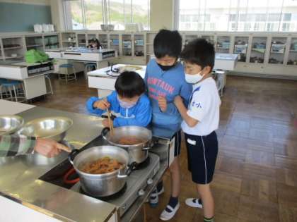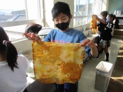 普段は捨ててしまう玉ねぎの皮を使って、バッグやハンカチを染めました。実際にできあがるまでどんな模様になるかわかりませんでしたが、できあがりにみんな満足です。