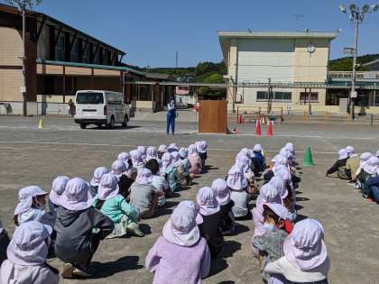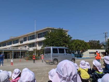 今日は、交通教室がありました。運動場に実際の自動車を走らせながら、交通指導員さんからためになるお話を聞きました。実際に見せてもらえたことで、道路の歩き方をより気をつけていかなければと感じたようです。