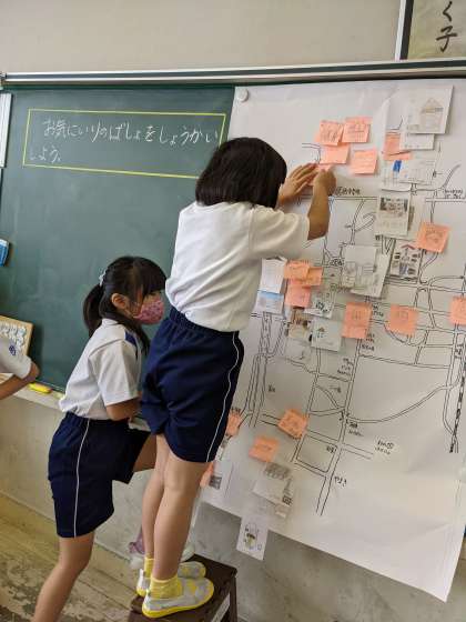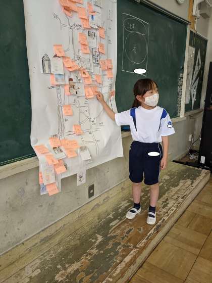 家の周りのお気に入りの場所を付箋に書いて紹介しました。友達の話を聞いて、行ってみたいという気持ちになったようです。