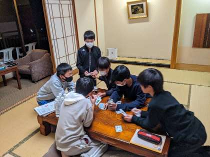 夕食後は少し部屋でまったり。1日目のふり返りをしたり、カードゲームをしてすごしています。