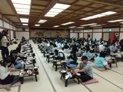 広間いっぱいの子どもたち、きっとつられてたべている子もいますね。
