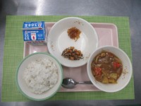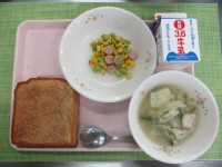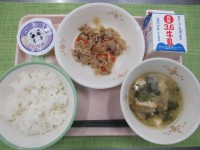 今日は、オムレツに手作りのホワイトルウで作ったソースをたっぷりかけました。ソテーやポークビーンズもついて、野菜たっぷり、ボリューム満点の給食でした!