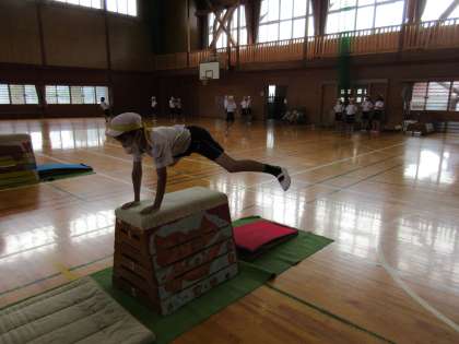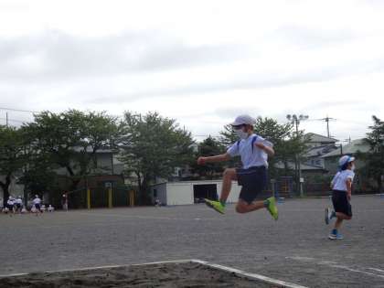 外は走り幅跳び、体育館は跳び箱。元気よく、体を動かしました!