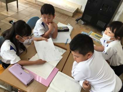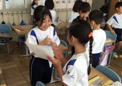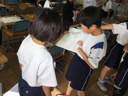 紹介する活動は今までに何回かやってきていますが、今回は聞いている友達に紙を見せながら、わかりやすくお話をすることに挑戦しました。お話が終わると拍手をしているペアもあり、温かい雰囲気の授業となりました。
