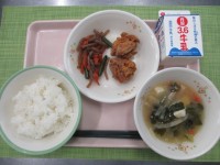 ごはん ぎゅうにゅう さわらのゆずみそあえ れんこんのきんぴら 静岡野菜のすいとん汁