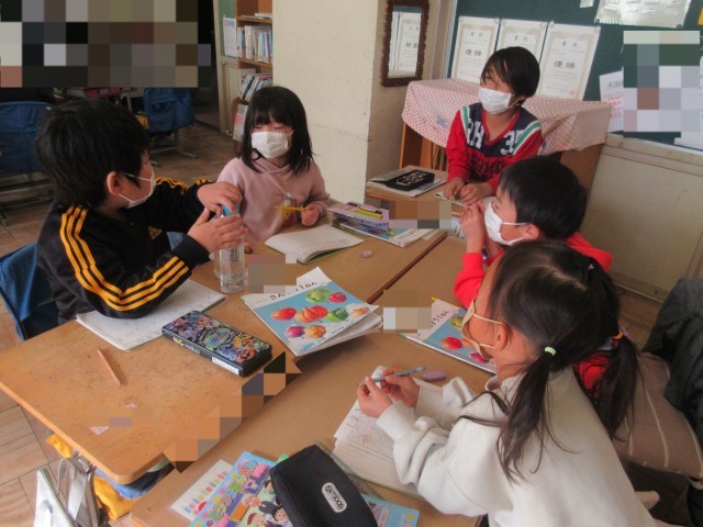 2つの違う容器に入った水の量を比べるには、どのようにしたらよいのか、グループで話し合いました。