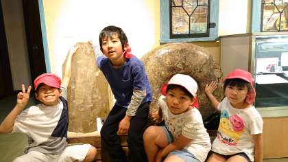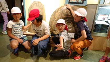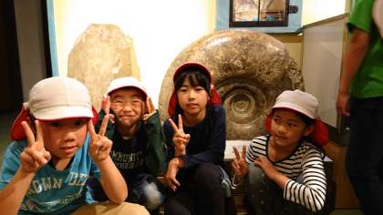 博物館の中を見学しています。アンモナイトかなぁ…
