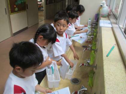 絵の具デビューです。お気に入りの色で背景を塗りました。みんな真剣!片付けもばっちり!みんな上手にできたね。