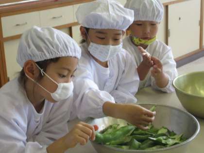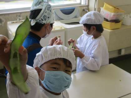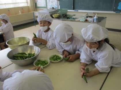 そらまめの皮むき体験をしました。「ねえ、ふわふわしたものがあるよ」と発見。栄養教諭からそらまめくんのベットのひみつを教わりました。