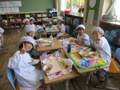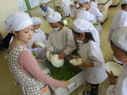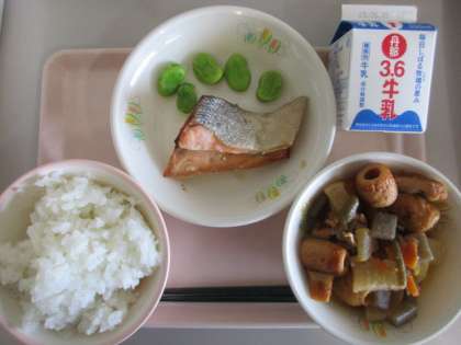 2年生がむいてくれたそらまめを給食でおいしくいただきました。ごちそうさま! みんな、そらまめのひみつが分かってうれしいね!