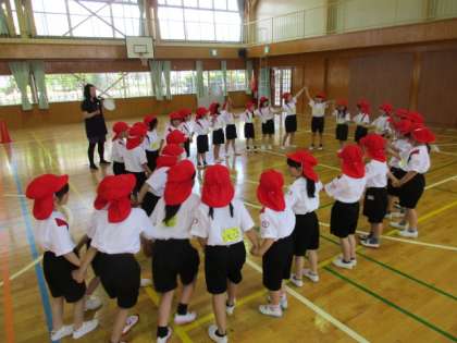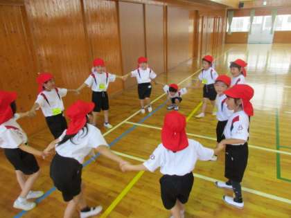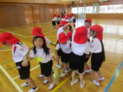 みんなで仲良く体ほぐしの運動です。たいこの音の数に合わせてグループをつくって、仲良く活動できました。