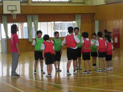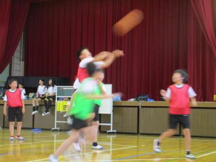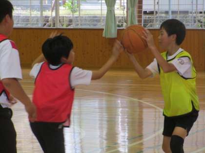 屋内スポーツクラブでは、バスケットーボールに挑戦。学年関係なく声をかけ合ってプレーしていました。
