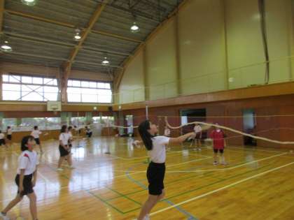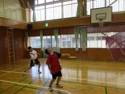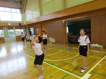 バドミントンクラブ。ペアでラリーを続けたり、ダブルスで対戦したりしました。みんな汗びっしょりになるくらい夢中でがんばっていました。