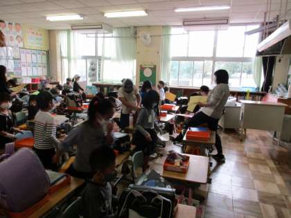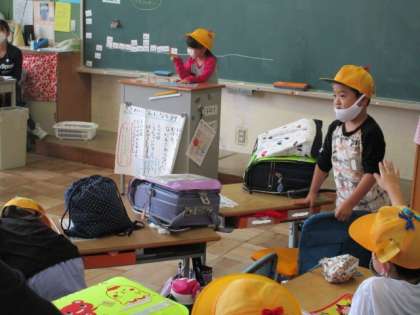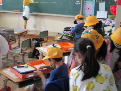 今日、1、2年生は給食を食べ終わってからの下校になりました。短い時間ですが、帰りの支度を素早く行って「さよなら。」しました。