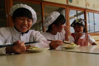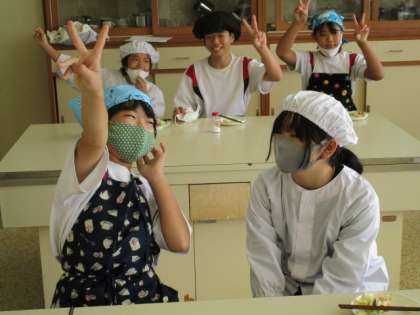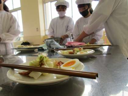 ゆでたまごとキャベツ炒めの調理をしました。包丁の持ち方やガスのつけ方を練習して、どの班も上手に仕上げられました。味は、顔を見るとよく分かります。