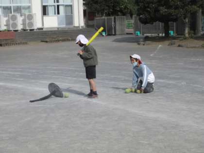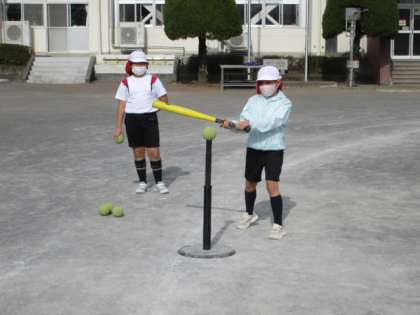 力強いバッティングですね。あれっ? ボールが飛ばずにティーが飛んだ? 素晴らしいパワーです。