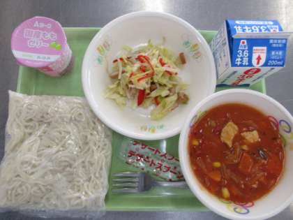 〔こんだて〕 ・ソフト麺 ・牛乳 ・野菜ソテー ・鶏肉とコーンのソース ・桃ゼリー