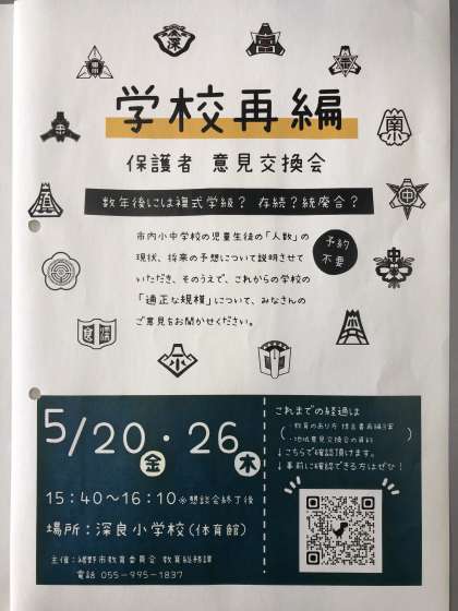 学校再編意見交換会 公開日 2022/05/11 更新日 2022/05/11 学校より 裾野市教育委員会教育総務課主催で、5月の参観の日に合わせて「学校再編保護者意見交換会」が開催されます。もしよろしければご意見をお聞かせください。