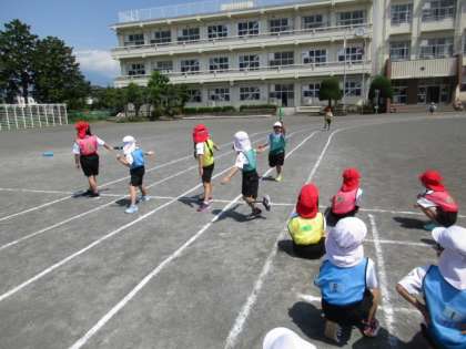 リレーです。リレーは、バトンの受け渡しが勝負の分かれ目。ここをいかにスムーズに行うかです。みんな上手にできています。