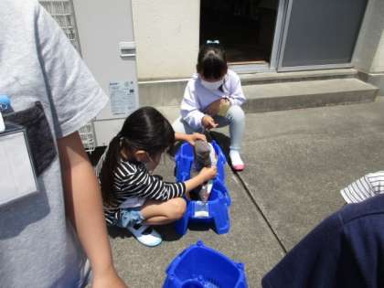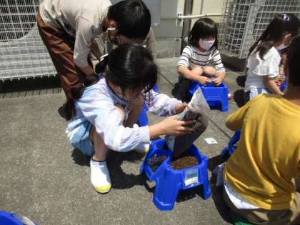 アサガオの種まきです。秋になって種を採るまでまで大切に育てましょう。