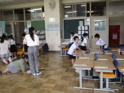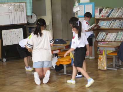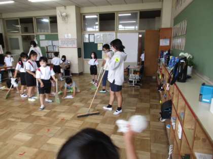 金曜日は朝そうじの日。1年生の教室には、6年生が手伝いに来てくれます。とっても頼りになります。ありがとう6年生!
