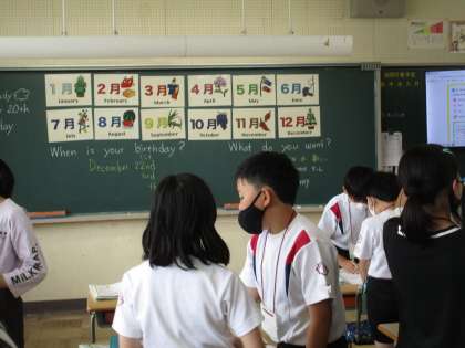 「When is your birthday?」と友だちに質問し、聞いた友だちの誕生日を用紙に記録します。私も参加しましたが、誕生日を子どもたちに伝えるのは抵抗がありません!(生まれた年や年齢はちょっと・・・)