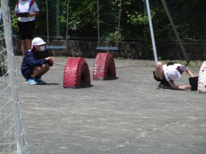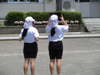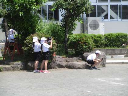 6年生が不審な動きをしている・・・・と思って聞いてみたところ、「図工で校舎の絵を描くために撮影しています。」とのこと。なるほど、タイヤ越しの校舎や木の向こうの校舎など、アングルにこだわっているのですね。