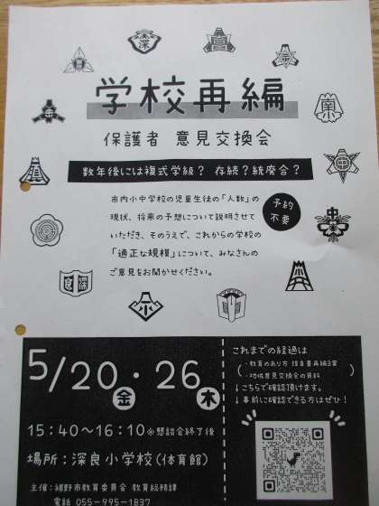 「学校再編保護者意見交換会」(裾野市教育委員会教育総務課主催)が、深良小体育館で行われます。1年生から6年生のすべての保護者の皆様が参加できます。よろしければ、ぜひご参加ください。
