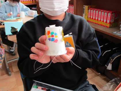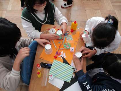 今日は工作の授業。ゴムの力で動くおもちゃを作っています。一人一人思いを巡らせながら楽しそうに作品作りに励んでいます。完成したらみんなで紹介し合うのが楽しみですね。