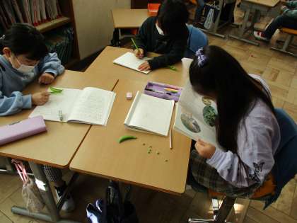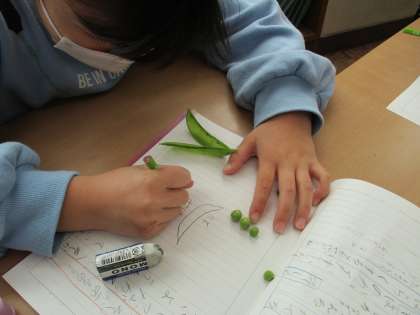 「まめ」についての学習です。「まめのへそってなんであるの?」そんな疑問を解決するために、今日は実物をじっくり観察しながら教科書を読み進めています。