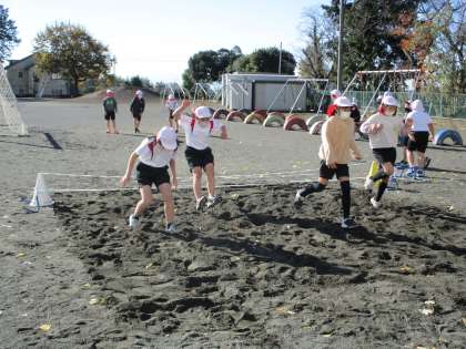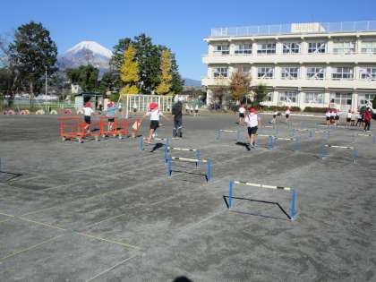 空気がひんやりとしていますが、富士山がはっきり見えるほどの青空です。5年生は寒さに負けず、走る・跳ぶ・投げるなど様々な運動に元気いっぱい挑戦していました。