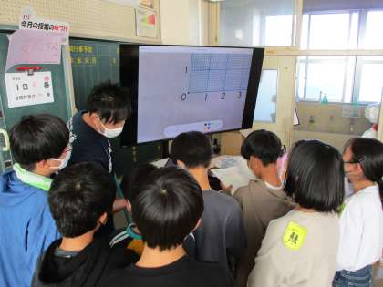 比例の授業です。グラフをかいたり数値を読み取ったりする学習のようですが、一目盛りがいくつになるのか、X=□のときYはいくつになるのか等々、とても難しい内容です。そんな中、困っている子たちはどんどん先生に質問に行きます。「分かりません」「教えてください」そうやって言えることも大切な力です。