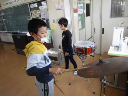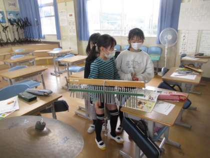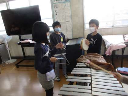 にぎやかな音に誘われて音楽室へ行くと、3年生がタンバリン、マラカス、マリンバ、シンバルなどを演奏していました。