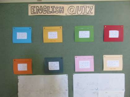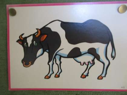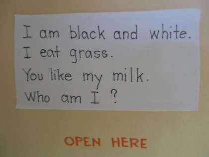 廊下にクイズがありました。白と黒? 草を食べる? ミルク?