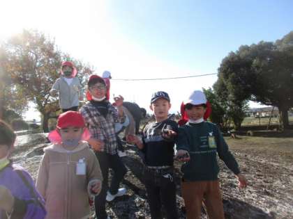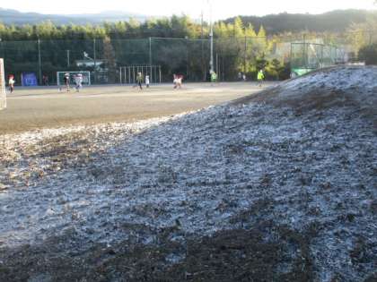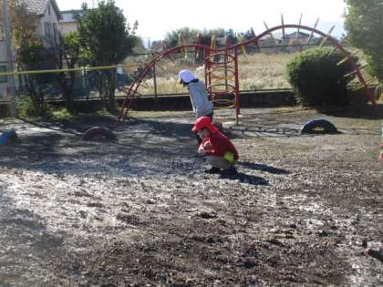 今朝は、ゴジラ山が霜柱で白くなっていました。触ると冷いなあと大人は思ってしまいますが、子どもたちの好奇心は止まりません。みんな楽しそうです。
