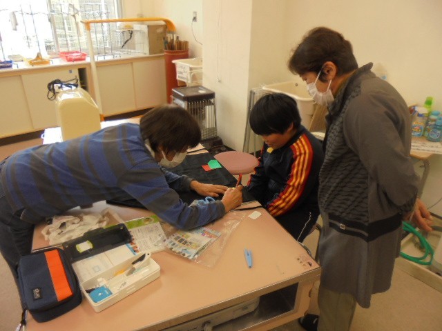 ミシンを使って出来上がったエプロンに、アイロンシートを使って飾り付けを行っていました。