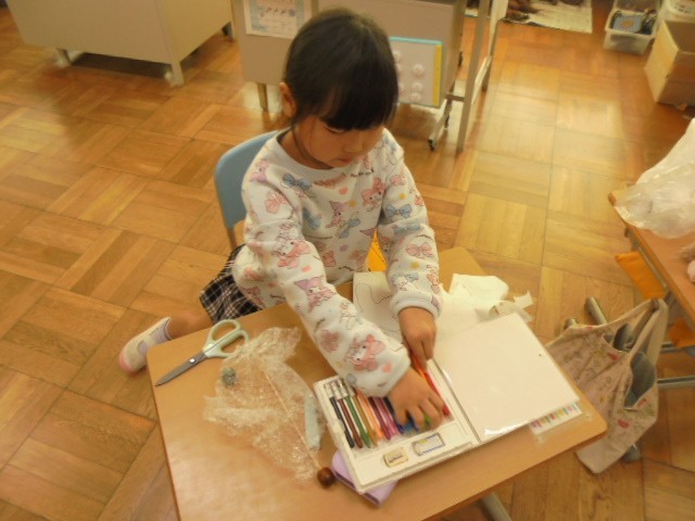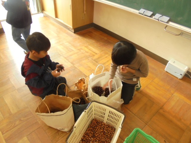 どんぐりや松ぼっくりなどを使って、秋のおもちゃを作っています。