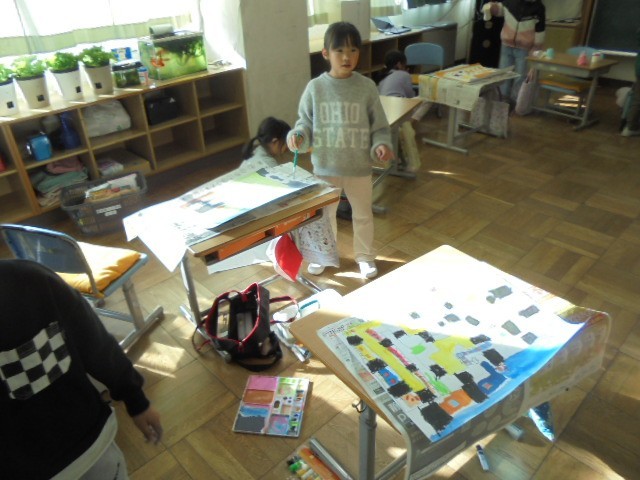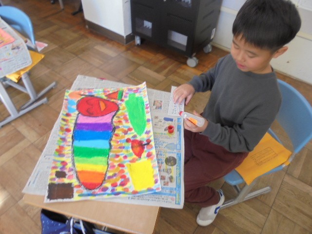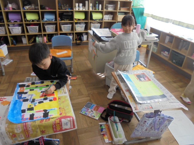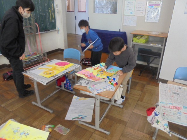 クレヨンや絵の具を使って、丁寧に塗り進めていました。