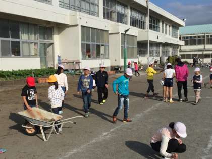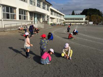 今日は、今月のわーくわーくタイムの日です。縦割り班ごとにグラウンドの分担した場所で石拾いをします。