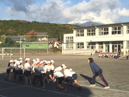 よい天気ではありますが、風が強く寒いです。しかし、その寒さも吹き飛ばす元気で子供たちは、朝運動に取り組んでいます。