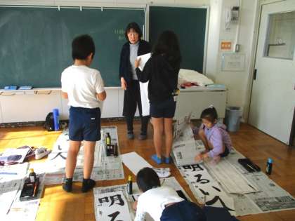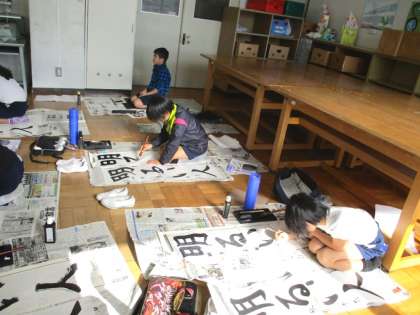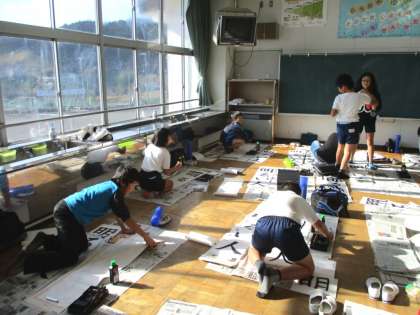 この時期ならではの風物詩、書き初めに挑戦。教室では手狭なので、スペースの広い図工室で行っていました。