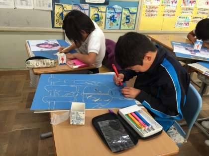 4年生は、彫刻刀を使って仕上げていく版画は初めてです。まずは輪郭から彫り進めていました。